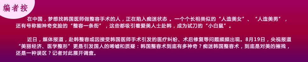 不是到了韓國遇到的每一位醫生都是“業界高手”。南方醫科大學南方醫院整形美容科胡志奇教授認為,韓國整形業整體的宣傳做得比較好,但中國在整形美容方面的技術絕對不遜于韓國,甚至要比韓國好。我國很多的年輕醫生都很努力好學,能夠掌握國際先進技術。記者采訪多位專家,對中韓的整形技術進行客觀評價。【詳細