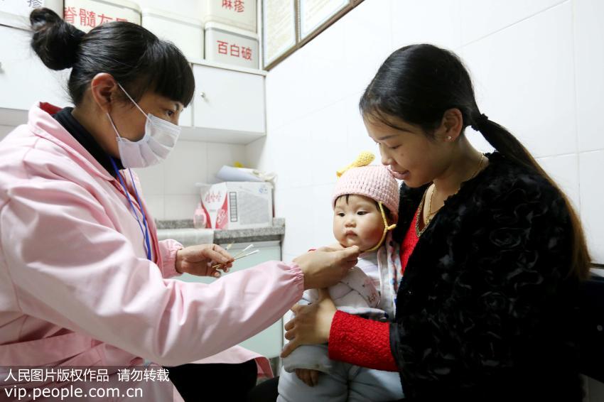 點擊下載本組圖片 廣西柳州市融安縣長安鎮衛生院,一名醫護人員在為兒童接種疫苗。(譚凱興/人民圖片【詳細】