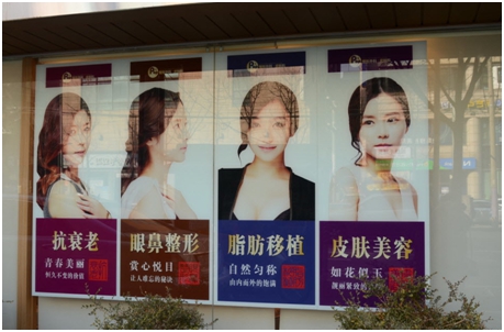 圖為韓國(guó)街頭的中文整形廣告(人民網(wǎng)張悅 攝)