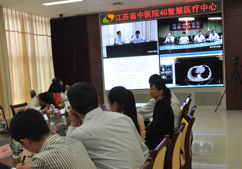 1、采訪團成員觀看江蘇省中醫院專家與睢寧縣中醫院的醫務人員遠程醫療會診(人民網記者 權娟攝)