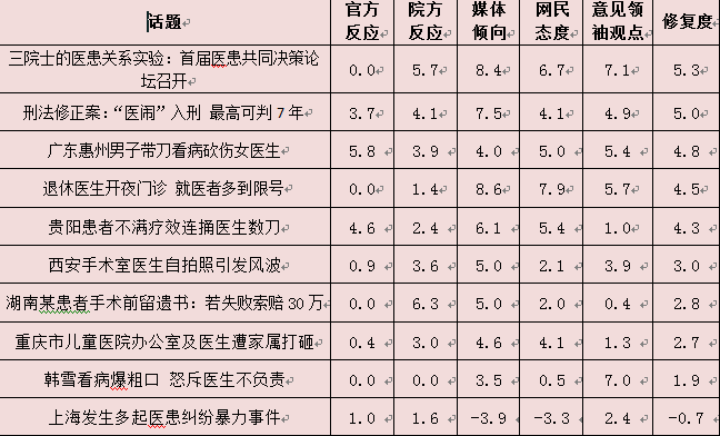 說明:分值范圍【-10—+10】。選取了2014年末至2015年8月份發生的10起與醫患關系密切相關的事件。人民網輿情監測室根據長期的研究經驗,制定了由官方反應、院方反應、媒體報道傾向、網民態度、意見領袖觀點五大維度組成的醫患關系修復度指標體系,并運用德爾菲法與層次分析法相結合的方式,通過專家函詢,得出各指標對于醫患關系修復的權重。