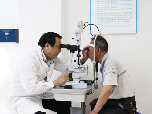 著名眼科專家盧奕教授為預約患者檢查眼睛