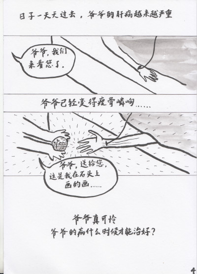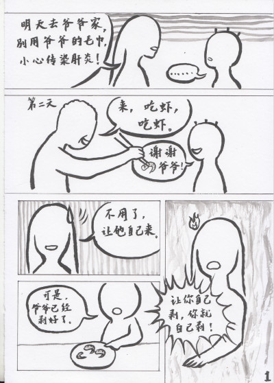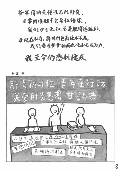 該漫畫根據個人親身經歷改編。主角的爺爺是慢性乙肝患者,本作品講述了孫子與爺爺過往經歷的斷片記憶,形象真實地再現了乙肝患者的生活。(圖文/廈門大學陳威)