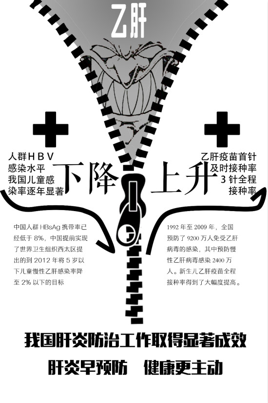 該作品通過(guò)海報(bào)的形式為讀者介紹了我國(guó)乙肝防治的現(xiàn)狀,作品中一個(gè)正要封鎖的拉鏈即將封住名為“乙肝”的惡魔,形象地顯示出我國(guó)為改善乙肝感染現(xiàn)狀做了諸多方面的努力,并通過(guò)列舉一個(gè)“下降”,一個(gè)“上升”來(lái)彰顯我國(guó)在乙肝防治方面的已取得的巨大成就。(圖文/華中師范大學(xué)許旎)