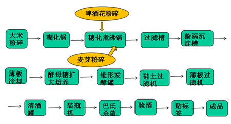 上圖是啤酒發(fā)酵的全過程。啤酒以大麥芽﹑酒花﹑水為主要原料﹐經(jīng)酵母發(fā)酵作用釀制而成的飽含二氧化碳的低酒精度酒。常用的輔助原料為:玉米﹑大米﹑大麥﹑小麥﹑淀粉﹑糖漿和糖類物質(zhì)等。雖然大米排在工藝的最前面,但是啤酒的主要原料一般是麥芽,而大米只是啤酒釀造的輔料,所以啤酒也被稱為液體面包。啤酒花是啤酒的特征性原料,為啤酒帶來其特有的風(fēng)味。