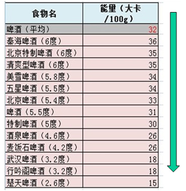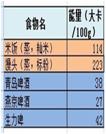 我們不妨做一個計算,看一下啤酒的能量與米飯or饅頭相比怎么樣?下圖是主食與兩種常見的啤酒能量值。