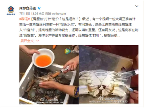 人民網北京7月19日電 (高奕楠)近日,一條給螃蟹打針注水的視頻在朋友圈中熱傳。視頻中,一名疑似商販的女士手拿一支裝滿橙色液體的針管,另一只手不斷從蟹筐中抓起螃蟹,迅速將液體注射到一只只螃蟹中。