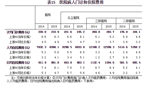 根據統計數據,按可比價格計算,2015年公立醫院次均門診費用上漲4.7%;人均住院費用上漲5.1%;鄉鎮衛生院門診和住院費用分別上漲4.2%和6.1%。病人費用漲幅低于城鄉居民人均收入增長速度(城鎮居民6.6%,農村居民7.5%)。醫藥費用增長受人口老齡化、慢性疾病模式,以及醫療技術進步等多種因素的影響,應加快實施醫保支付方式改革,引導和規范醫療行為,控制費用不合理增長。