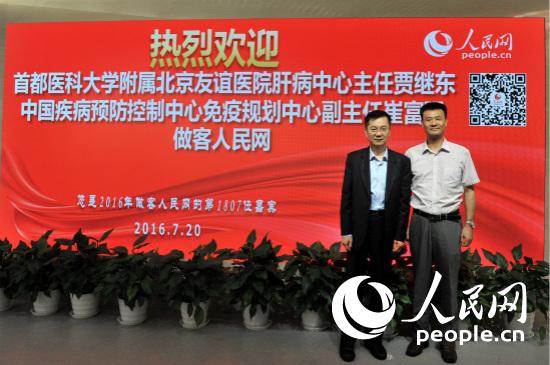 首都醫科大學附屬北京友誼醫院肝病中心主任賈繼東(左)、中國疾病預防控制中心免疫規劃中心副主任崔富強做客人民網。(人民網記者韓淑賢 攝)