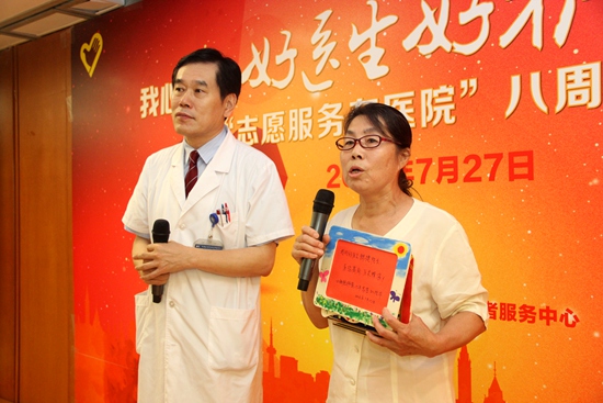 人民網北京7月28日電(陳燁菲) “謝謝您,赫大夫!13年過去了,可能您的患者太多,已經忘記了我,但是我永遠會記得您。當年我得了肺癌,以為被判了死刑,是您的鼓勵幫助和精湛醫術給了我第二次生命!今天能夠再次有機會當面感謝您我很激動!”一位患者眼中噙著淚水,向時隔13年再次見到的中國醫學科學院腫瘤醫院院長赫捷院士深深鞠躬。醫患和諧感人的一幕幕,在昨日由中國醫學科學院腫瘤醫院患者服務中心舉辦的我的好醫生好護士主題活動暨“志愿服務在醫院”八周年總結活動中溫馨上演。