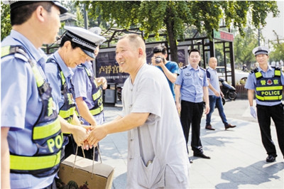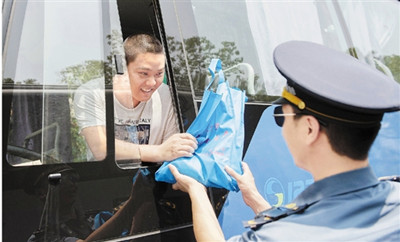 景寧畬族自治縣道路運管工作人員向司機發防暑用品。 (圖/浙江日報李肅人 沈奇云)