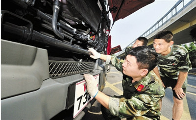 杭州消防支隊修理所官兵冒著高溫維護保養消防車。 (圖/浙江日報盧日成)