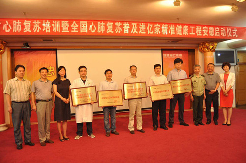 會上王立祥教授代表中華醫學會科學普及分會、中國研究型醫院學會心肺復蘇學專業委員會授牌安徽省急救中心為“全國心肺復蘇普及進億家精準健康工程協作單位”;合肥市第一人民醫院為“中華精準健康傳播基地”;安徽醫科大學第二附屬醫院為“腹部心肺復蘇應用轉化基地”;安徽省立醫院為“心肺復蘇醫教研基地”、“全國心肺復蘇普及進億家精準健康工程培訓單位”、“腹部心肺復蘇應用轉化基地”。