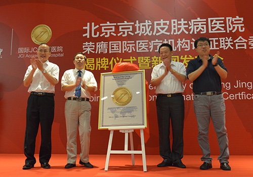 人民網北京8月9日電 (王亞微)祥云醫療旗下北京京城皮膚病醫院作為國內首家皮膚病?漆t院通過了JCI國際認證。中國醫師協會名譽會長殷大奎、中國非公立醫療協會辦公室主任張平、朝陽區衛計委副主任楊樺、北京京城皮膚病醫院名譽院長王家璧、北京京城皮膚病醫院業務院長戈光輝等嘉賓參加了揭牌儀式和新聞發布會。