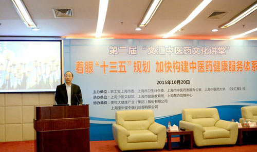 圖為2015年10月20日,農(nóng)工黨上海市委會(huì)等共同主辦的第二期文匯中醫(yī)藥文化講堂開講,聚焦健康服務(wù)業(yè)與中醫(yī)藥發(fā)展契機(jī)。農(nóng)工黨中央副主席蔡威出席并講話