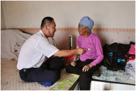 還有一次,有個鄰居打電話求助,說他年近九旬的老母早飯后出現(xiàn)氣短、嘔吐并伴有上腹痛。考慮到老人行動不便,情況危急,王虎軍趕緊放下診所內(nèi)的患者過去出診。經(jīng)過觀察發(fā)現(xiàn),嘔吐物為胃內(nèi)容物,脈膊疾且結(jié)代,老人出冷汗。王虎軍有對老人聽診,發(fā)現(xiàn)第一心音低鈍且心律紊亂。他趕緊告訴這家人,懷疑老人突發(fā)心梗需要住院治療。據(jù)王虎軍回憶,這家人可能不知病情的嚴重性,就一直讓他給老人輸液。后來又說不懂該如何辦理住院手續(xù),又怕路上病人有什么不測要求王虎軍送他們?nèi)メt(yī)院。為了能讓老人盡快得到救治,王虎軍就開著自己的車把病人和家屬送往烏審旗人民醫(yī)院。多虧送得及時,老人最后轉(zhuǎn)危為安。