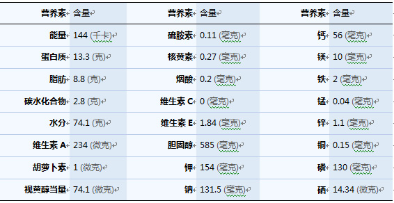 100克雞蛋中的能量和營養素含量