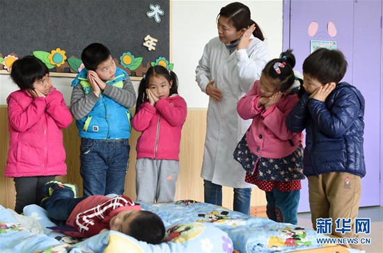 合肥市翠庭園社區(qū)衛(wèi)生服務(wù)站的醫(yī)生為小朋友講解睡眠姿勢。(圖片來源:新華網(wǎng))