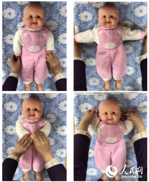 預備姿勢:嬰兒仰臥并腿,兩臂屈曲放在胸前。成人左手扶嬰兒胸腹部,右手墊于嬰兒背部。