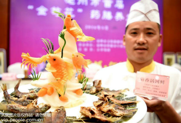 安徽省亳州市舉辦的藥膳養生大賽上,一位選手在展示自己的作品。(劉勤利/人民圖片)