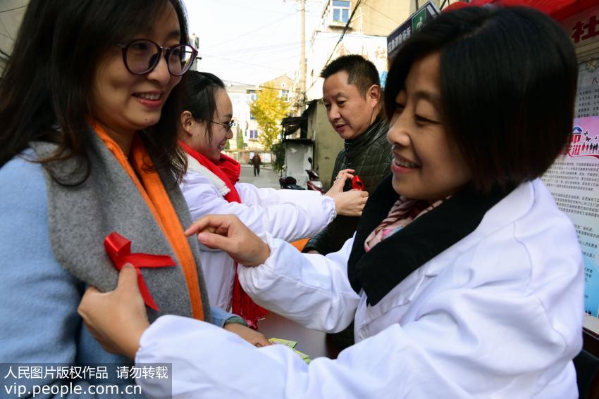 2016年11月28日,疾控中心工作人員在為居民佩戴紅絲帶。(圖片來源:石玉成/人民圖片)