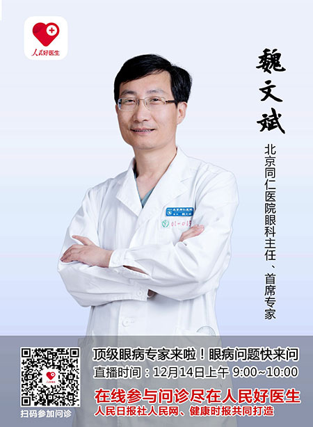 12月14日(周三)9:00~10:00,由人民日報社人民網、健康時報聯手打造的“人民好醫生”客戶端將邀請北京同仁醫院眼科主任、首席專家魏文斌教授進行視頻、圖文直播,在線解答各種眼病問題。