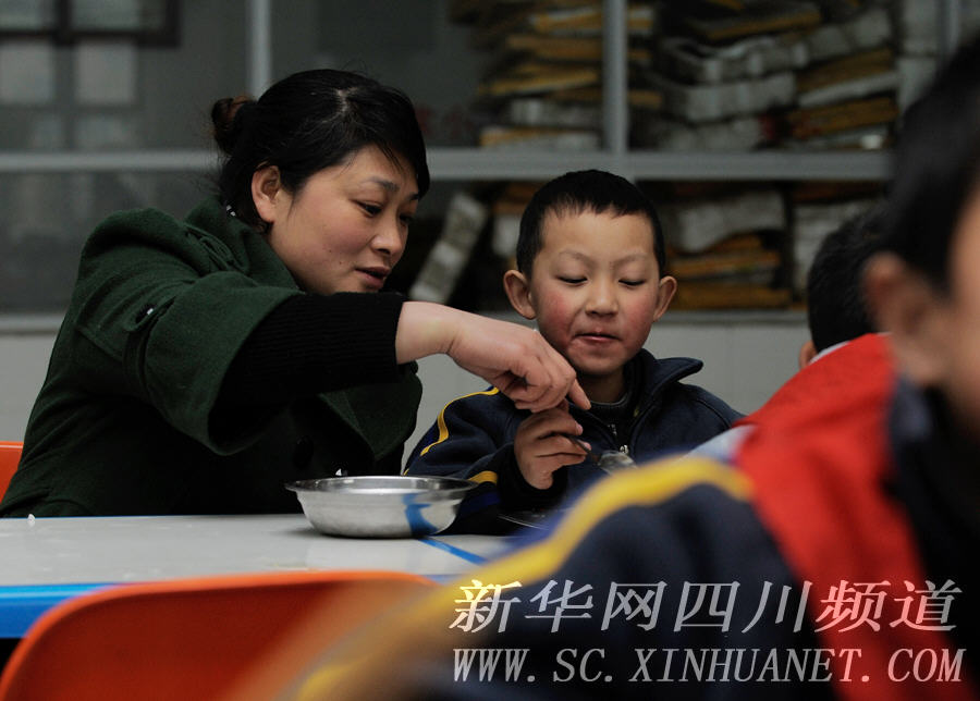 成都市雙流縣“安康家園”的阿姨帶領小學部的孩子吃飯(圖片來源:李橋橋/新華社)