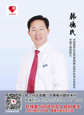 12月21日(周三)下午12:30-13:30,由人民日報社人民網、健康時報聯手打造的“人民好醫生”客戶端將邀請中國工程院院士韓德民進行視頻、圖文直播,在線解答各種耳鼻喉問題。