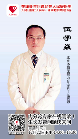 12月22日(周四)14:00,由人民日報社人民網、健康時報聯手打造的“人民好醫生”客戶端將邀請北京協和醫院內分泌科主任醫師伍學焱教授進行視頻、圖文直播,在線解答各種內分泌問題。