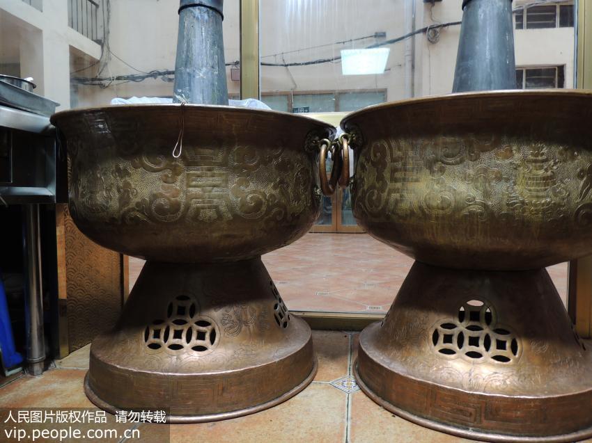 西寧市一餐館烹煮食物的大銅火鍋吸引食客的眼球。(史廷義/人民圖片)