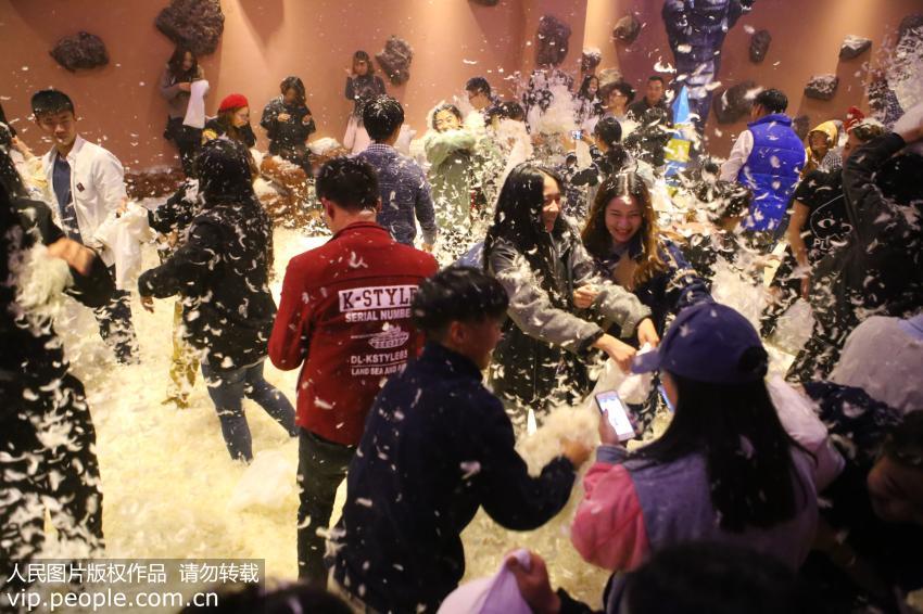 2016年12月24日,大學生上演“枕頭大戰”。(李發興/人民圖片)