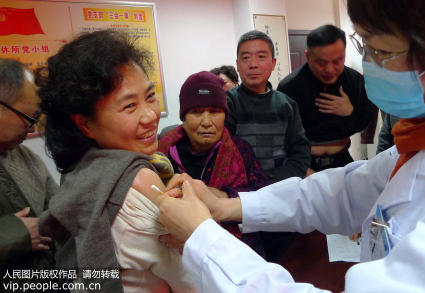 12月27日下午,安徽省淮北市疾病預防控制中心預防接種北大廳的醫務人員來到淮北市軍隊離退休干部休養所,為43名軍休干部注射流感疫苗。(圖片來源:李春輝/人民圖片)