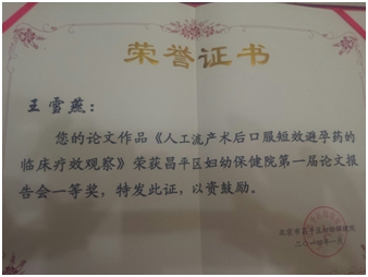 團隊積累了豐富的臨床資料,經(jīng)過整理分析后,撰寫的論文《人工流產(chǎn)后口服短效避孕藥的臨床療效觀察》獲得2013年度院內(nèi)論文比賽一等獎,并在中文核心期刊《中國婦幼保健》雜志上發(fā)表。