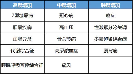 認知-行為是減重方案的首要調節因素,只有肥胖者充分意識到肥胖的危害性、減重后的獲益,他們才有堅持下去的動力。肥胖病并發其他疾病的風險非常高,如下圖所示,肥胖病會不同程度增加病發其他疾病的風險。