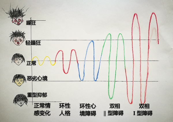 值得注意的是,這里的環(huán)性人格(如上圖所示)不包括在雙相情感障礙的范圍內,其臨床表現的嚴重程度低于環(huán)性心境障礙(如上圖所示),是一種人格特征,社會功能良好,有可能但不一定會發(fā)展為環(huán)性心境障礙。