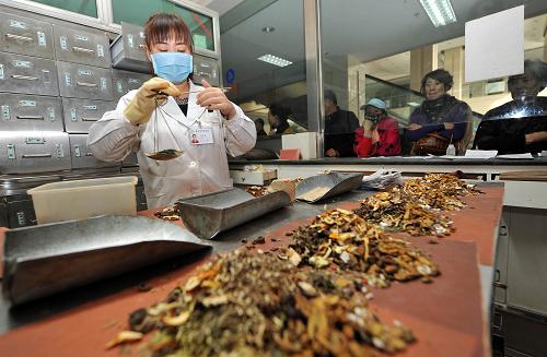 銀川市中醫(yī)院藥劑師在配中藥。(王鵬/新華社)