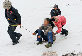 廣西桂林市全州縣東山瑤族鄉清水街,孩子們在雪地里玩耍。(周華/新華社)