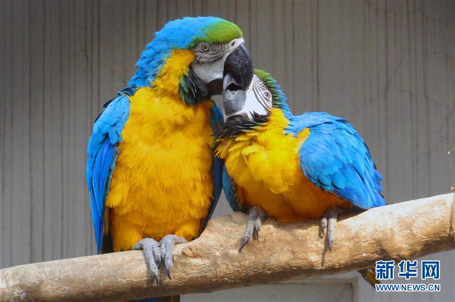 江蘇省蘇州動(dòng)物園內(nèi)的鸚鵡相依相偎,盡享浪漫。(王建康/新華社)
