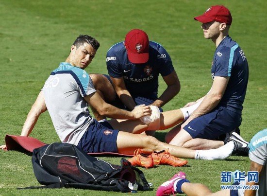 2014年6月18日,葡萄牙隊球員克里斯蒂亞諾·羅納爾多在訓練中膝部感到不適,并接受隊醫治療。(圖片來源:新華網)
