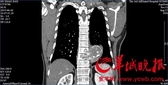 一位患者的脊柱已被腫瘤包圍。(圖片來源:金羊網)
