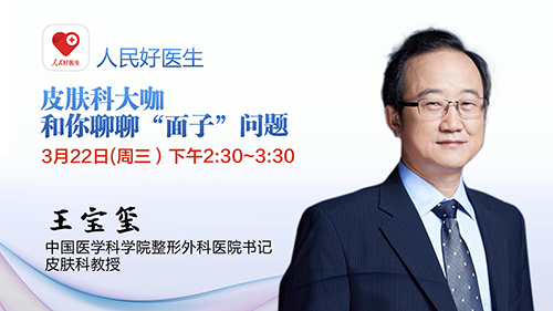 3月22日(周三)下午2:30-3:30,由人民日報社人民網、健康時報聯手打造的“人民好醫生”客戶端將邀請中國醫學科學院整形外科醫院書記、皮膚科主任醫師王寶璽教授進行視頻、圖文直播,為您在線解答跟皮膚有關的問題。