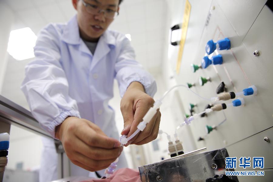 中國(guó)科學(xué)院武漢物理與數(shù)學(xué)研究所人體肺部磁共振成像實(shí)驗(yàn)室,實(shí)驗(yàn)人員在超極化裝置前收集實(shí)驗(yàn)氣體。(金立旺/新華社)