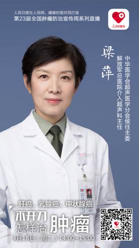 在2017全國腫瘤防治宣傳周,由人民日報社人民網、健康時報聯手打造的“人民好醫生”客戶端將邀請解放軍總醫院(301醫院)介入超聲科主任梁萍教授,于4月18日(周二)下午14:00-15:00進行視頻、圖文直播,在線解答關于腫瘤的介入超聲治療問題,快來提問吧!