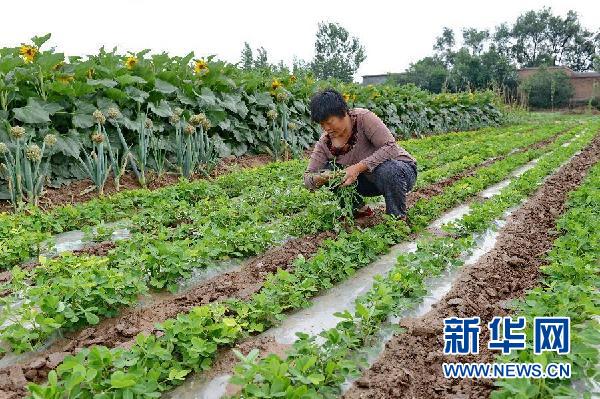 河北省邢臺市新河縣南馮村一農民在花生地里除草。(楊世堯/新華網)