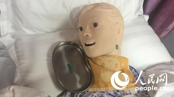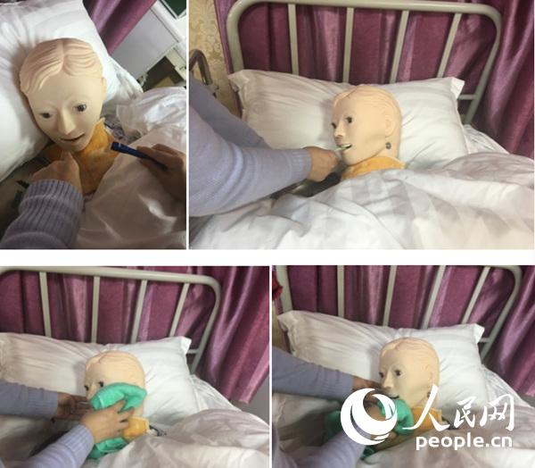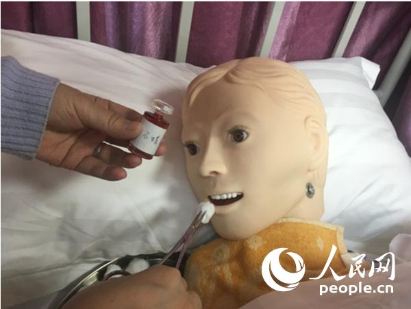 護理者幫助老人將頭側(cè)向一邊,頜下鋪小毛巾,將彎盤置老人口角旁。(“達醫(yī)曉護”供圖)