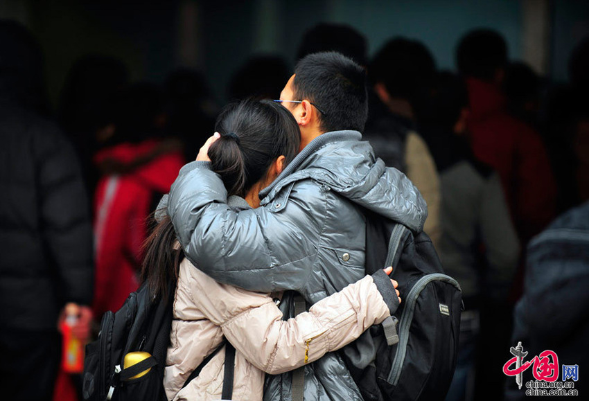 一對(duì)情侶在進(jìn)站口前緊緊相擁。(寧峰/中國(guó)網(wǎng))