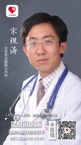 面對這樣一個對身體危害嚴重的疾病,如何做好預防也成了大家關心的問題。5月11日(周四)下午2:30,由人民日報社人民網、健康時報聯手打造的“人民好醫生”客戶端將邀請北京安貞醫院心內一科主任醫師宋現濤教授進行視頻、圖文直播,為廣大網友講解與冠心病有關的前沿知識,并在線解答網友提問,不容錯過!