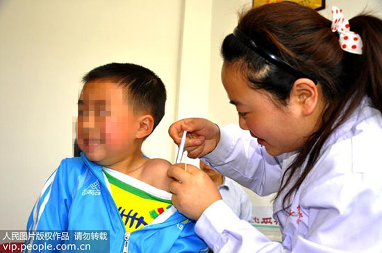 2014年6月3日,在湖北省恩施市紅土鄉(xiāng)愛立幼兒園里,醫(yī)務人員正在給孩子接種水痘疫苗。(彭紹峰/人民圖片)