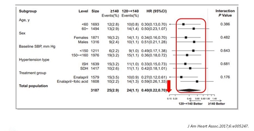 中國腦卒中一級預(yù)防研究(CSPPT)后續(xù)研究顯示,一級高血壓患者(樣本量3187例),將收縮壓嚴(yán)格控制在140mmHg以下,可顯著降低卒中風(fēng)險60%。相關(guān)的研究刊登在2017年出版的J Am Heart Assoc雜志。