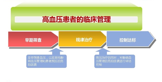 高血壓患者的臨床管理,應(yīng)早期篩查、確診是否為高血壓患者,確定影響血壓管理的其他危險因素;及時并規(guī)律地給予降壓藥物治療;最大可能控制血壓達標(biāo)。